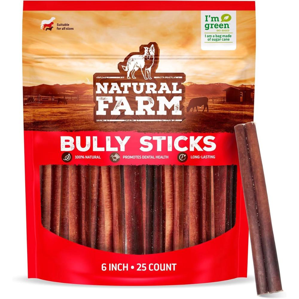 Natural Farm Bully Sticks, Odor-Free (12 Inch, 5 Count), 8.8 Oz. Per Bag, 100% Beef Chews, Grass-Fed, Non-GMO, Fully Digestible Dental Treats to Keep Your Small and Medium Dogs Busy and Happy(6" Bully Stick. 25 Units)